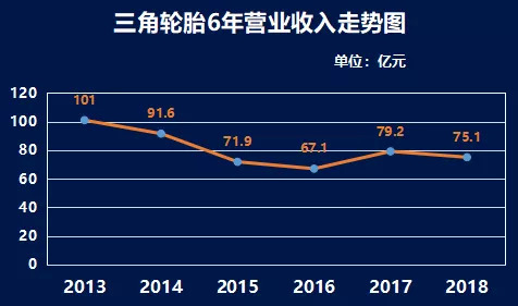 2013年,三角轮胎的营业收入达到近6年的最高值101亿元,随后便一直下滑,在2016年达到最低值,仅有67.1亿元;2017年实现反弹,当年营业收入达到79.2亿元,但2018年又开始走下坡路,营业收入只有75.1亿元。