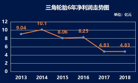 直接反应到财务数据:2018年三角轮胎营收75.1亿元,相比去年的79.2亿元下降5.17%,更是比2013年创造的103亿营收大幅下滑27%;净利润4.83亿元,相比2017年下滑0.09%,对比2014年10.1亿元,骤降52%。