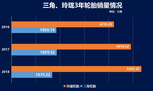 最后我们再来看看销量,由于轮胎企业上市后都需要披露销量,因此我们才可以拿到准确的销量数据,我们就对比一下2016-2018年,三角轮胎和玲珑轮胎在销量上的差距。