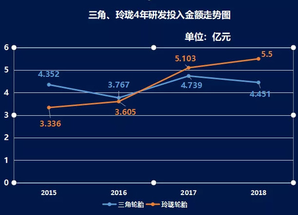 上文已经提到,三角轮胎的产品乏善可陈,那是不是三角轮胎在研发上的投入不足导致的呢?三角轮胎在2018年投入的研发费用高达4.45亿元,拥有研发人员874人,占全年总营收的5.93%。往前追溯2017年研发投入4.74亿,2016年研发投入3.77亿,这样的投入力度不可谓不高,但是这样的高投入的产出效果却并不乐观。