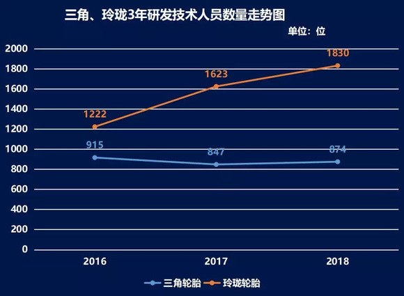 我们从年报中获悉,2016年三角轮胎拥有研发技术人员915人,2017年下降到了848人,2018年研发技术人员为874人。与2016年相比,研发技术人员下降了4%。与此相对应的是玲珑轮胎2016年拥有研发技术人员1222人,2017年1623人,2018年达到了1830人。与2016年相比,研发技术人员增加了50%。两相对比,我们不难看出两家企业对人才重视程度的天差地别。
