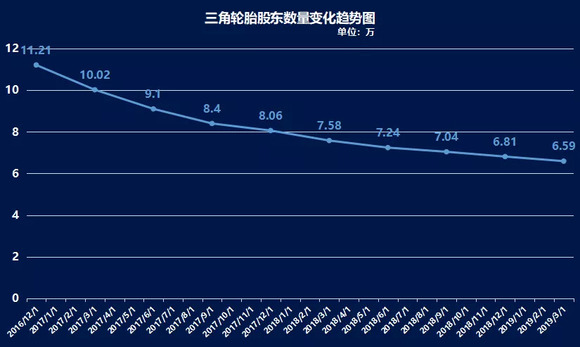 与三角轮胎股价和市值暴跌相对应的是投资人用脚投票,从上市到2019年3月31日,三角轮胎股东数量均呈下滑趋势,三角轮胎股东人数从2016年12月31日的112121户下滑到2019年3月31日的65931户,降幅高达41%。