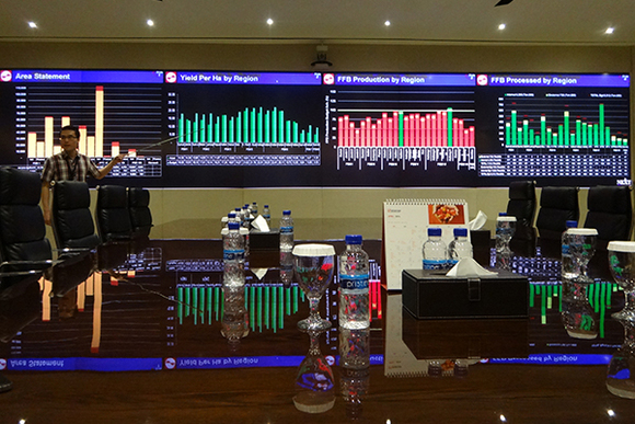 巨型投影屏幕上,一张完整的印尼卫星地图尽收眼底。金光将旗下东西纵横8500公里、总计433200公顷的种植园,以每30公顷为单位划分为若干块,实施24小时监控,并根据每块园区作物的实际情况,评估收成;对低产园区,预警、断症、并给出可行的解决方案。