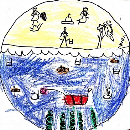 在向大家介绍这幅画时,她写到“我在三亚的时候,在沙滩上玩的很开心。沙滩上有很多人,深海里有很多的鱼,它们不小心就会吃掉很多垃圾死掉,都是沙滩上玩的人扔的。我希望有一个深海潜水垃圾艇,它可以把所有垃圾吸走,这样小鱼就不会死了。”