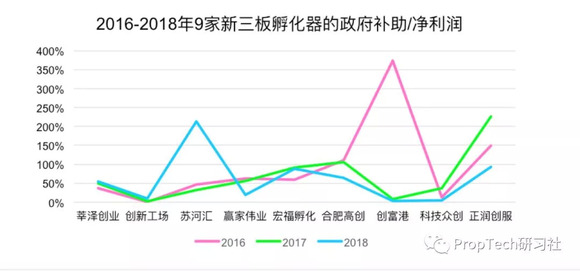 PropTech研习社统计这9家孵化器最近三年年补贴总额发现,他们在2018年拿到的政府补贴要比2017年少了三成多。从前面那张图可以看得出来,包括赢家伟业、科技寺、苏河汇在内的部分孵化器,在2018年拿到政府补贴实际上直接“膝斩”了。