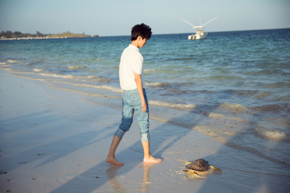 三月份,在肯尼亚的马林迪马塔姆海滩上,王俊凯和瓦塔木海龟保育中心的工作人员一起,将受伤治愈后的海龟重新放回大海。他看着海龟一步一步爬回大海,直至它们的身影消失在海洋里。