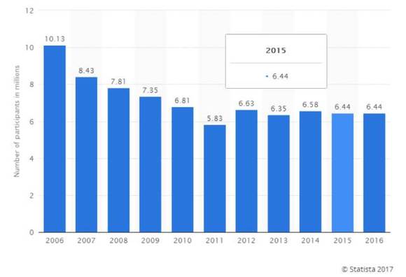 2006-2016年美国滑手数量(数据来源:statista)