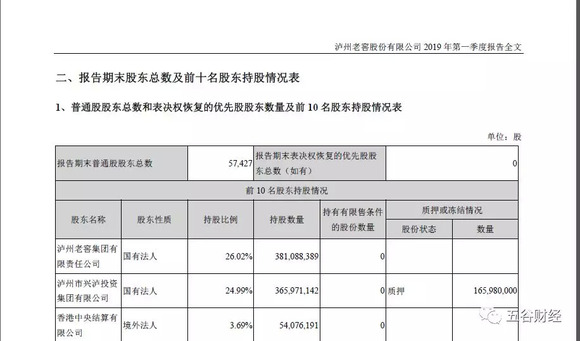 《五谷财经》注意到,泸州老窖发布的2019年第一季报显示,泸州老窖集团持有泸州老窖26.02%的股权,位列第一大股东。