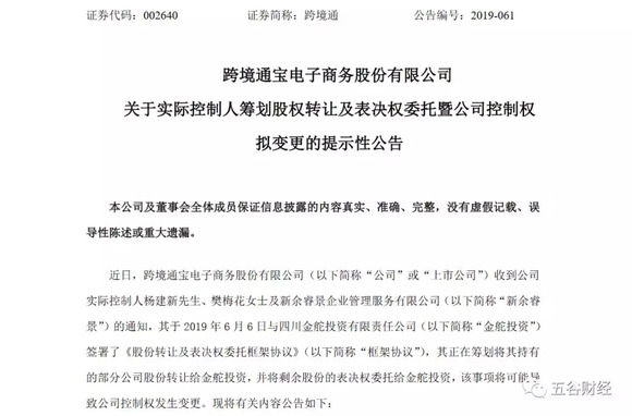 公告显示,跨境通收到公司实际控制人杨建新、樊梅花及新余睿景企业管理服务有限公司(下称“新余睿景”)的通知,其于2019年6月6日与四川金舵投资有限责任公司(下称“金舵投资”)签署了《股份转让及表决权委托框架协议》(下称“框架协议”),其正在筹划将其持有的部分公司股份转让给金舵投资,并将剩余股份的表决权委托给金舵投资,该事项将可能导致公司控制权发生变更。