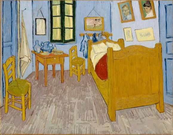 先说说这次来东京出差的梵高《在阿尔的卧室》。1888年2月,梵高离开喧闹的都市,独自来到阿尔勒,租住在“黄房子”旅馆里。梵高搬进黄房子之后,一共画了五幅《阿尔勒的卧室》,三幅油画和两幅草图,它们代表了梵高不同的心境。梵高创作的三幅《阿尔勒的卧室》油画中的第一幅,现收藏于阿姆斯特丹梵高美术馆里,被认为是三件作品中最好的一幅,这是梵高在等待他的好基友——高更到来时画的,色调偏暖。