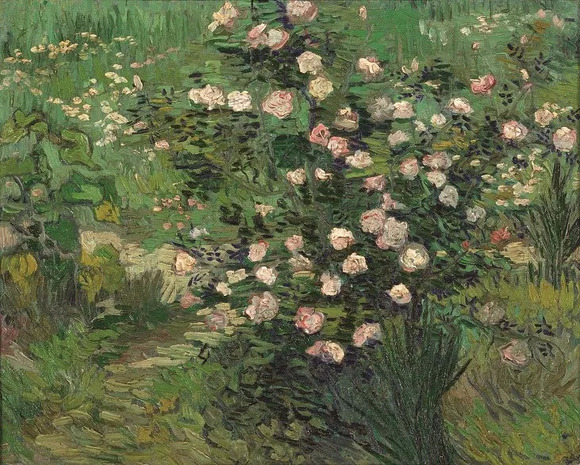 梵高去世前一年所绘,此时已经入住圣雷米精神疗养院,描绘在此地盛开的玫瑰花,画中可见他晚期作品的特征——激烈与扭动的笔触。