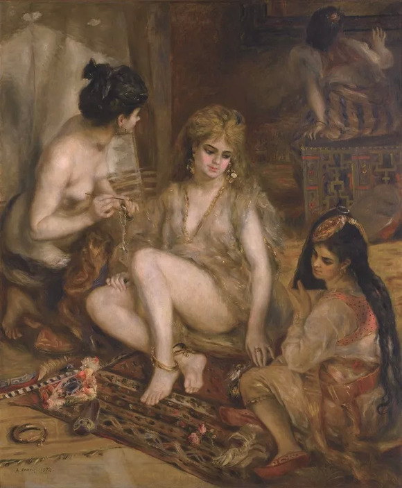 印象派的另一位大师雷诺阿,在30岁左右曾一度醉心于浪漫主义代表画家德拉克洛瓦的色彩,仿照德拉克洛瓦描绘过一些富有东方情趣的“异国情调”的作品,这件完成于1872年的《阿尔及利亚打扮的巴黎少女》便是其中之一。由于当时雷诺阿的个人艺术风格还未形成,艺术技巧也尚未成熟,这幅作品送展沙龙被拒之门外。但是女人体,以及她们身上佩戴的漂亮小饰件,倒成了他日后作品中不可缺少的元素。