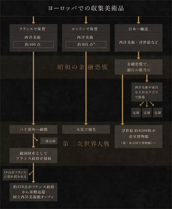 1945年二战结束,日本在战争中属于侵略的一方,并与纳粹德国关系友好,法国以敌国资产为借口,将其收归国有。1947 年,法国将其中 21 件藏品卖出,18 件绝世名作 — — 包括梵高的《在阿尔的卧室》等则保留于法国奥赛美术馆。