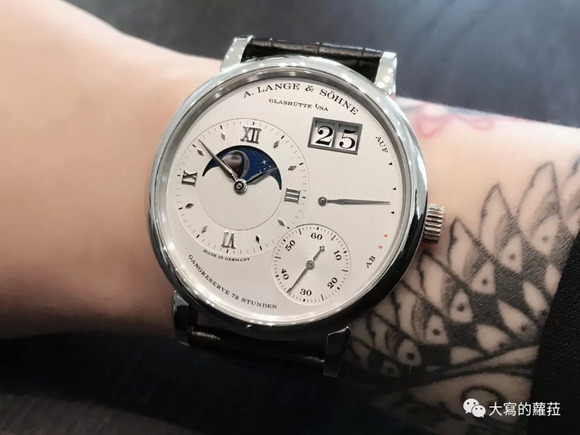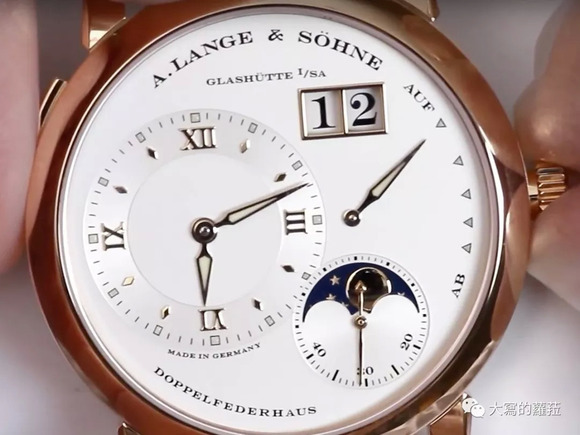 另外我还要提提朗格的月相显示结构,在Lange 1月相腕表中所使用的精确月相可以达到99.998%的精确度,主要原因就在于一般常规的月相机制皆以齿轮的倍速来精化且缩减月相显示与真实月相周期时间差异,与其他设计不同的是:朗格将一个以七个齿轮组成的传动装置连结于月相显示机制与走时分钟轮系之间,因此在将真实月相周期模拟化为齿轮倍速推进时,朗格的月相精确程度可以控制在一分钟之内,而此精准月相显示可每隔122.6年仅需调校一次。永远比常规设计再多一点什么,这就是朗格追求极致完美的使命,即便我们在和谐且简洁易读的朗格腕表面盘上,看不出在这个简约背后其实是靠如此复杂且魔鬼般的细节构成。