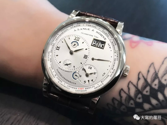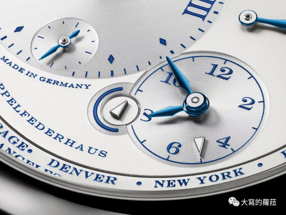 与其他世界时区表不同的是:朗格的世界时区可同时显示两个不同地点的时、分显示及两地的日夜显示,并且连动指定的世界城市名的时间同步。听起来复杂的讯息在朗格世界时区Time Zone腕表上,一点都不是问题,大日期窗中央格线第二地时区与动力储存针轴在同一个垂直线上,第二地时区和日夜显示指示针轴也在同一个水平线上,偏心时、分与小秒、日夜显示的针轴也在同一个垂直线上,这也成就了我们在外观视觉上,也对朗格的表款设计无可挑剔的重要原因。