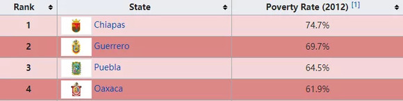 这就导致了几乎无法挽救的贫困。墨西哥南部的恰帕斯州,瓦哈卡州和格雷罗州正是全国最贫穷的州,贫困率全部都在60%以上,比一些非洲国家更高。(1.恰帕斯州,2.格雷罗州,4.瓦哈卡州)
