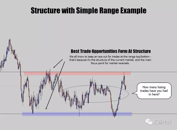 另一个大家可能经常听到,但是很少实践起来的建议,就是要利用技术分析识别市场结构。要定义当前市场的行为模式,我认为最简单的例子是区间市场,价格在区间内波动,而在上限和下限的位置就是很好的结构点,这里会出现很好的交易机会。