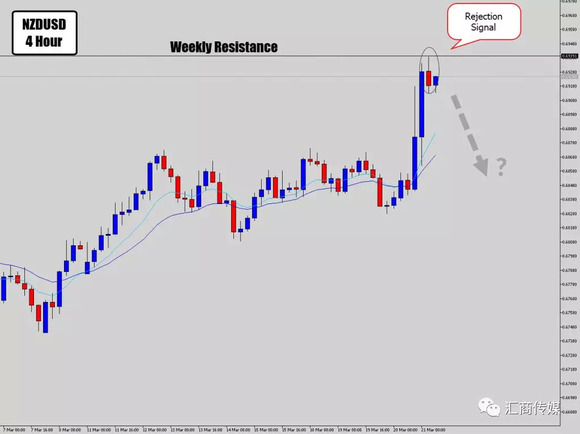 这时候自上而下的分析就显示其作用了。周图中有明显的阻力位,因此我们寻找卖出信号。4小时图上则显示出周图上信号背后的微观力量: