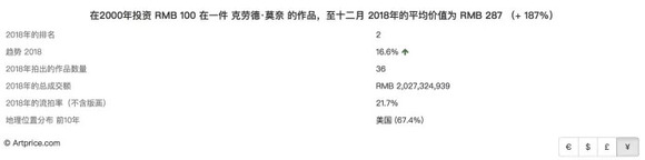 2018年莫奈市场表现情况(数据来源:Artprice)