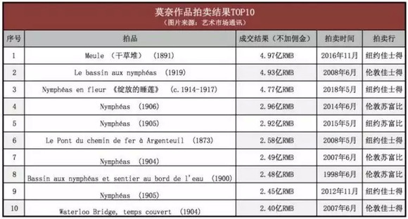 莫奈部分拍卖成交过亿元作品(数据来源:艺术市场通讯 2018年统计)