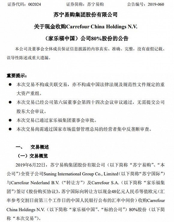 6月23日17点,苏宁易购突然发布告称,公司全资子公司苏宁国际拟出资48亿元人民币等值欧元收购家乐福中国80%股份。本次交易完成后,苏宁易购将成为家乐福中国控股股东,家乐福集团持股比例降至20%。