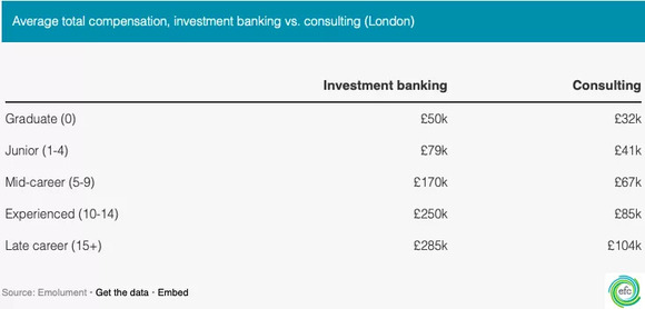 大部分人找工作,第一点都是关注薪资情况,一家专注于薪资排名的网站Emolument.com上的薪资对比表明,在投行的前台部门获得的薪水比咨询多。