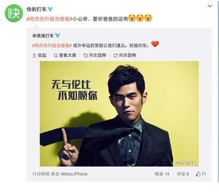 而快的与滴滴一起携手推,滴滴原发,快的转发,这种“品牌矩阵”策略也是对的,原本就是相亲相爱的一对品牌,符合热点剧情,入戏自然。