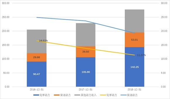 具体来看,化学动力、柴油机动力以及海洋核动力业务是中国动力营收贡献最大的三个业务。2018年,这三个业务分别实现营业收入142.25亿元、53.01亿元、47.24亿元,占营收比例分别为47.96%、17.87%、15.93%。