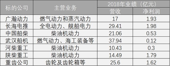 七家标的公司的主营业务为燃气动力、蒸汽动力、全电动力、柴油机动力等。财务数据显示,七家标的公司2018年的营收累计为155.93亿元,净利润合计为8.27亿元。这其中,营收水平较高的标的公司为武汉船机、长海电推重齿公司以及中国船柴,分别实现营业收入37.94亿元、29.41亿元、25.60亿元以及21.06亿元。而盈利能力较强的标的公司为长海电推、广瀚动力、陕柴重工以及重齿公司,净利润分别为1.98亿元、1.93亿元、1.79亿元和1.62亿元。
