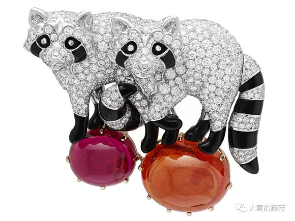 △ 浣熊胸针,白K金、玫瑰金、钻石、缟玛瑙、锰铝榴石与粉红色碧玺。(图片版权归梵克雅宝所有)