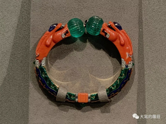 其中瑞兽手环是最明显地由中国古时金质瑞兽手环的设计影响,以玉、翡翠、珊瑚、玛瑙等材质创作的瑞兽手环更显装饰艺术(Art Deco)时代里,西方国家对于东方世界的心神向往表征,用一种特殊的眼光去观看神秘的中国,再用自己的设计语言诠释属于卡地亚的风格。