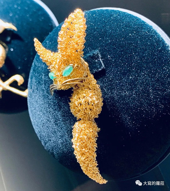 这个以西域传来的工艺结合中国特有的符号象征,精美的錾刻、抛光打磨与鎏金工艺,让这对上下回首相望的金色狐狸,显得祥和且幸福。这让我联想到在梵克雅宝上海IFC的专门店里看到的一只小狐狸胸针,这么娇小且害羞,像极了小说《小王子》里那个真心理解所谓真爱道理却得不到小王子〝驯服〞眷顾的小狐狸。