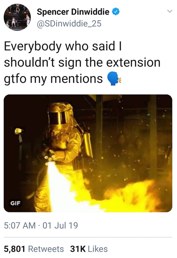 布鲁克林篮网后卫斯潘塞·丁威迪今天更新了个人推特:“当初谁说我不该续约篮网来着,别让我看见你。”