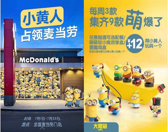 事实上,小黄人形象的火爆早在两年前就已经初现端倪。为了配合《卑鄙的我2》全球推广战略,2013年11月麦当劳就推出过小黄人公仔,不少城市也出现过供不应求的状况,淘宝上甚至卖到了“千元一套”。而随着今年《小黄人》大电影的上映,这个黄色玩偶一跃成为电影主角,更是成为品牌借力营销的对象。