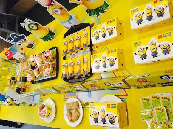 由于7月是国产电影保护月,刚刚在北美地区获得首周票房冠军的《小黄人》大电影可能无缘与内地观众见面,可这并没有影响国内消费者对这个呆萌到极致的卡通人物的热情,在上海的5家麦当劳“小黄人”主题门店里,人们兴奋地与门口的卡通人物肖像合影,再进店点一份黄色纸盒包装的“大眼萌”麦趣鸡盒。