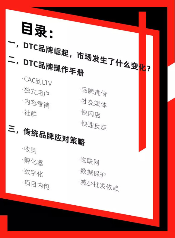 DTC:Direct to Consumer,又称D2C,直译为“直接面向消费者”。可以简单理解为没有线下渠道、没有中间商赚差价的新一代互联网原生品牌。