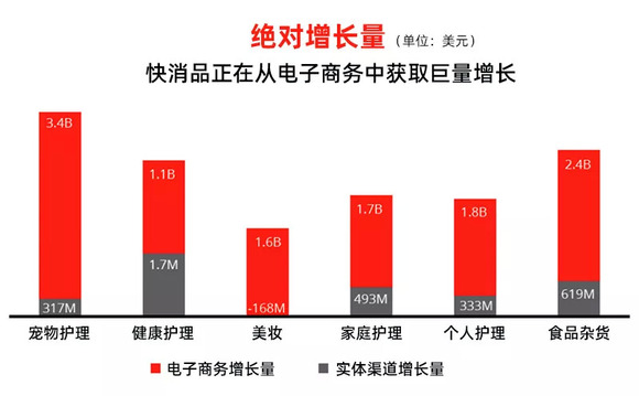 在快消品的各个领域中,数字零售的增长都远远超过实体店。其中最为显著的是美妆行业,实体店已经开始遭遇负增长,绝对增量都来自于电商。