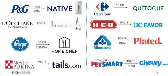 以下为快消品巨头宝洁、欧舒丹、克罗格(零售)、雀巢普瑞纳(宠物食品)、家乐福、H·E·B、艾柏森、PetSmart近两年来的收购案例,其收购对象无一例外都包含了DTC品牌。