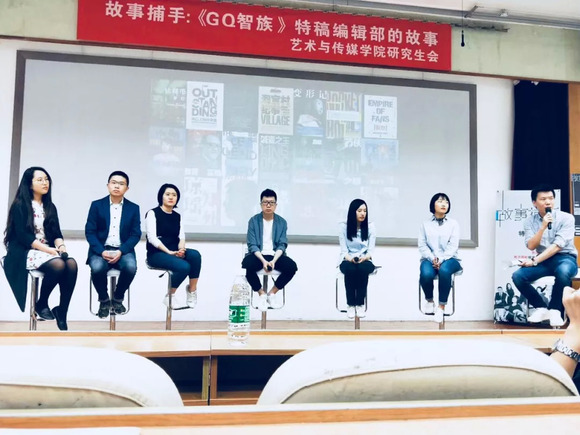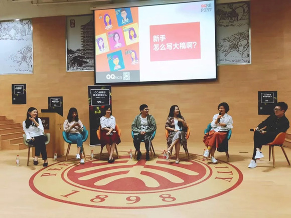 《智族GQ》报道组在北京师范大学做沙龙,从左到右,人物分别是于蒙、康路凯、刘敏、何瑫、靳锦、洪蔚琳、曾鸣(《智族GQ》编辑总监)