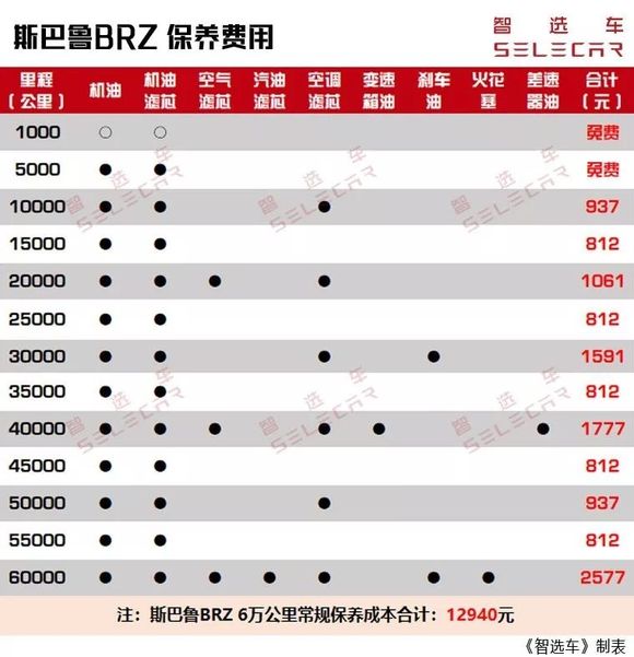 从上表中可以发现,斯巴鲁BRZ前6万公里的常规保养成本合计为12940元。从计算结果来看,斯巴鲁BRZ的保养费用相较合资品牌确实更贵,但还是要比同价位的豪华品牌B级车便宜不少,而且斯巴鲁官方还赠送了一张5000元的维修保养代金券。