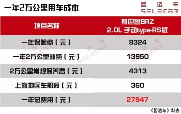 买完斯巴鲁BRZ之后的压力究竟有多大呢?最后,我依然以1年两万公里为计算标准,将各项开销都汇总在一起得出一年的用车成本。