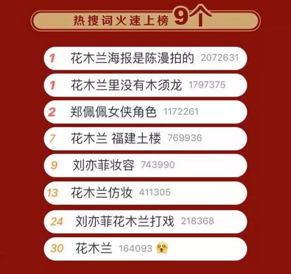 从铺天盖地的刷屏就能看出《花木兰》的热度,其中热搜上榜达到了9次,拿到了两次第一,一次第二。堪称碾压级的热度。要知道,这仅仅是它的首款预告片而已,而接下来的一系列物料势必将再度造成这种“拥堵”现象。