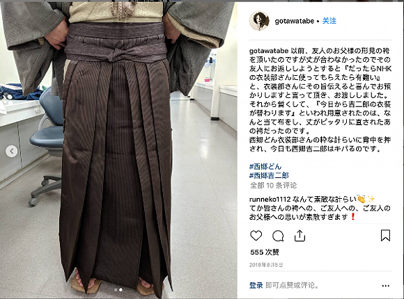 上图:《西乡殿》演员渡部豪太个人 Instagram 展示戏服细节