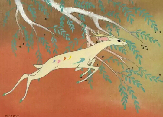 这部动画短片的故事来自于敦煌壁画上的佛教故事,画风也借签了敦煌壁画的风格,虽是动画片,却拍出了神秘慈悲的佛教蕴味,最终国王欲射死九色鹿,却为神迹所阻挡,这神迹以及九色鹿的配音,都给人以凛然不可冒犯之感。