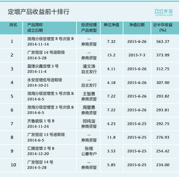 此外,2015年上半年十大高收益定增产品还包括“渤海分级定增宝5号次级B”(第5位,近半年收益率293.82%)、“齐鲁碧辰1号B”(第7位,近半年收益率292%)、“广发恒定13号进取级”(第8位,近半年相对收益率276%)。