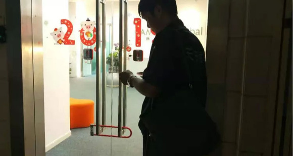 在门口等待了3分钟后,一名上了年纪的红衣女性工作人员从里间出来走向玻璃大门。时代财经一行再次表达了采访的请求。但这名工作人员从身后拿出一把U型大锁,从里面将大门给锁了起来,然后前台区域的所有工作人员都进入了里间。