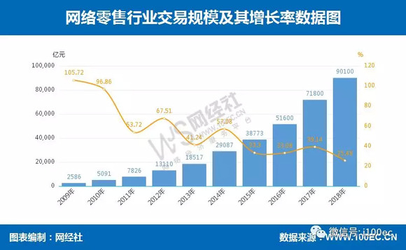 据网经社电子商务研究中心(100EC.CN)数据监测显示,2014年-2018年网络零售行业交易规模分别为2.91万亿元、3.88万亿元、5.16万亿元、7.2万亿元、9.01万亿元,分别同比增长57.08、33.3%、33.08%、39.14%、25.48%,增长势头显著且稳定。在2016年到2017年期间,呈现快速增长趋势,2017年到2018年这两年虽保持增长,但有所放缓。数据表明,在消费领域继续保持高速增长的大背景下,网络渠道消费增长日益显著,线上零售市场规模稳定增长,电商导购平台加速崛起。