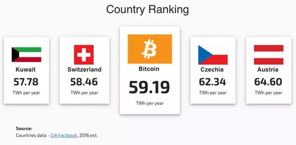 从剑桥大学新推出的」剑桥比特币电力消费指数「(CBECI)看,比特币消耗的电量占全球耗电量的 0.27%,即 56.33 太瓦时的电力消耗。从另一个角度看,比特币 59 太瓦时(TWh)的耗电量,比瑞士整个国家的全年的电力消耗的还要多,仅次于澳大利亚和捷克。