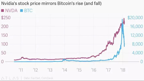 在 PoW 共识的工作原理,用户挖矿需要算一道数学题,在数以亿计的尝试下,才有可能算出结果,拿到区块链系统提供的奖励。在 PoW 区块链中,算力是共识,谁的算力强谁获胜。在比特币价格高企的那段时间里,英伟达、AMD 等显卡矿机公司的股价和比特币价格同步涨跌。