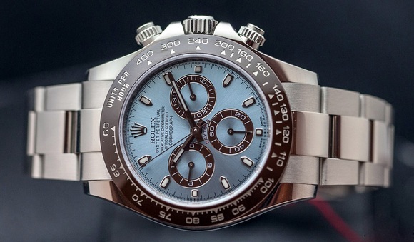 自然界铂储量比金还稀少,价格也比金贵出许多,铂金腕表毋庸置疑都是各家的顶级产品,比如劳力士只有Day-Date和Daytona系列才有铂金款,并且只有铂金款才会搭配漂亮的冰蓝色表盘;再比如百达翡丽使用铂金表壳的腕表,都会在表壳六点钟位置镶嵌一枚小钻石。这些铂金腕表可是价格不菲。